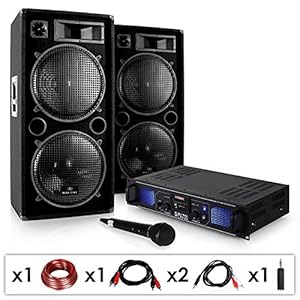 "DJ-20" Equipo PA Amplificador Altavoces Micro Cables 2000W El amplificador PA y DJ envía tus pistas de audio sin esfuerzo a los altavoces Auna PW2222 con una potente salida de 700W. Estos vienen completamente equipados con dos grandes bass drivers de 30 cm (12") cada uno para lanzar toda su potencia directamente al público. El amplificador estéreo DJ ofrece conexiones RCA para dispositivos de audio como pletinas, reproductores de CD y tocadiscos, así como una entrada AUX frontal adicional. Si eso no es suficiente, también tiene la opción de conectar una memoria USB o tarjeta SD para la reproducción de pistas MP3. Un sistema integrado de radio receptor FM complementa paquete completo. Junto con el amplificador básico y los componentes del altavoz, y el cableado completo para que puedas ponerlo en funcionamiento nada más sacarlo de su caja, el set DJ-20 viene con un micrófono dinámico para uso en Karaoke y presentaciones, por lo que es perfecto para bodas y eventos de empresa. El micrófono incluido se puede conectar a tu ordenador portátil o a una mesa de mezclas por separado, pero no se puede conectar al amplificador que se incluye. Uso recomendado:• Ideal para eventos privados y comerciales• Perfecto para bodas y fiestas de empresa• Adecuado para eventos con capacidad para 300 personas Contenido del envío:• 2 x Auna PW-2222 PA DJ Altavoz 3 vias 2x 30cm (12") 1000W• 1 x Skytec SPL-700 Amplificador PA DJ 2000W USB SD• 1 x Micrófono de Karaoke dinámico DMM-1280• 1 x Cable altavoces 10m 2x1.5 mm transparente• 2 x Cable Jack RCA para conectar el PC a Mesa de Mezclas• 1 x Cable RCA estéreo de 2 metros.