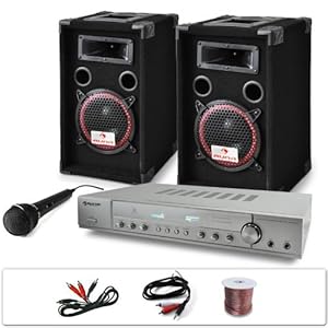 El equipo PA "DJ 11" es un potente set ideal para principiantes y con excelentes cualidades para ocuparse del sonido en fiestas familiares. También resulta muy adecuado para celebraciones de bodas, fiestas de cumpleaños, ferias, presentaciones y conferencias en escenarios medianos. Concebido para eventos de hasta 100 invitados se puede conectar sin problemas cualquier equipo HiFi a este amplificador surround de 5 canales de la casa Auna. Sus 400W le permiten no solo funcionar en el ámbito de cine en casa sino también conectado a los altavoces DJ. Sus 2 entradas de micrófono permiten empezar sesiones de karaoke en cualquier momento. Sus conexiones RCA y jack ofrecen la posibilidad de conectarse de manera rápida a cualquier dispositivo de reproducción de audio y transmitir un sonido de alta calidad a hasta 5 altavoces. Este multifuncional amplificador satisface cualquier deseo ya que es ideal tanto para obtener un potente sonido en fiestas como para garantizar un sonido envolvente en sesiones de cine en casa. Su receptor de radio y su elegante y discreto diseño permiten que este amplificador se integre perfectamente a todo equipo HiFi de cualquier hogar. Este equipo PA dispone también de un par de altavoces bassreflex con un subwoofer de 20cm (8") y una potencia total de 2x 500 vatios. El robusto diseño, la resistente cubierta de fieltro, las rejillas protectoras, la protección de esquinas y las asas para el transporte garantizan una gran movilidad. Envío: • 1 x Amplificador surround Auna AMP-2540-S de 5 canales• 1 x Par de altavoces Auna XEN-3508• 1 x Micrófono dinámico DMM-1280• 1 x cableado (1 x cable de altavoz, 1 x cable RCA, 1 x cable RCA a jack)